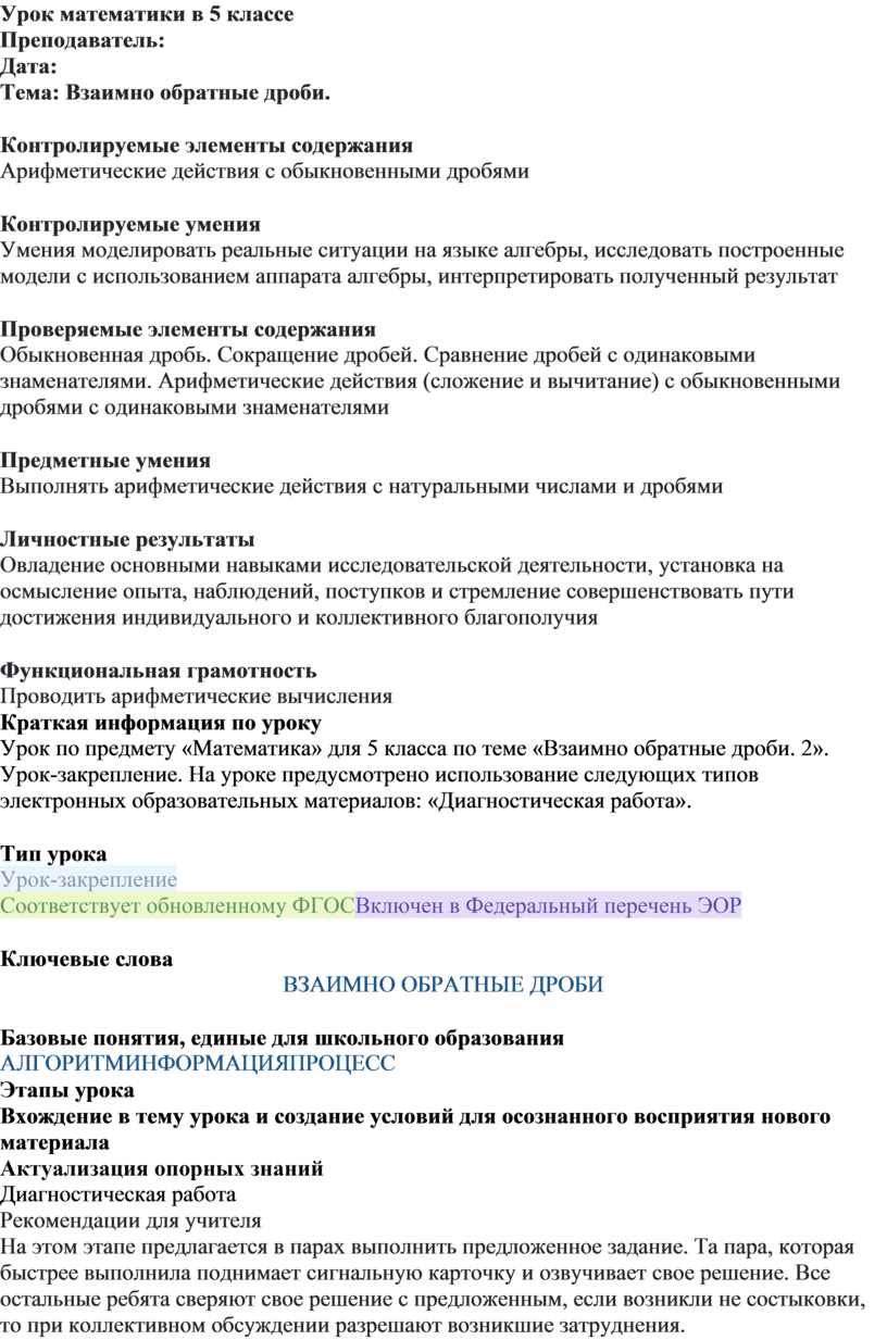 Урок по предмету «Математика» для 5 класса по теме «Взаимно обратные дроби. 2». Урок-закрепление. На уроке предусмотрено использование следующих типов электронных образовательных материалов: «Диагностическая работа».