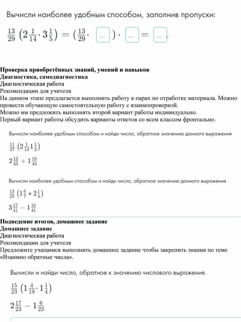 Предложите учащимся выполнить домашнее задание чтобы закрепить знания по теме «Взаимно обратные числа».