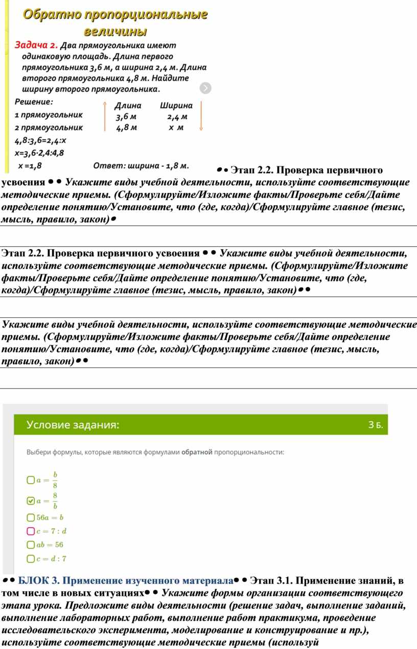 Укажите формы организации соответствующего этапа урока. Предложите виды деятельности (решение задач, выполнение заданий, выполнение лабораторных работ, выполнение работ практикума, проведение исследовательского эксперимента, моделирование и конструирование и пр.), используйте соответствующие методические приемы (используй правило/закон/формулу/теорию/идею/принцип и т.д.; докажите истинность/ложность утверждения и т.д.; аргументируйте собственное мнение; выполните задание; решите задачу; выполните/сделайте практическую/лабораторную работу и т.д.). |
