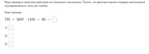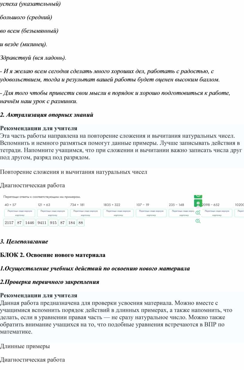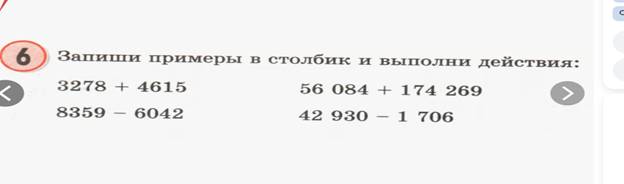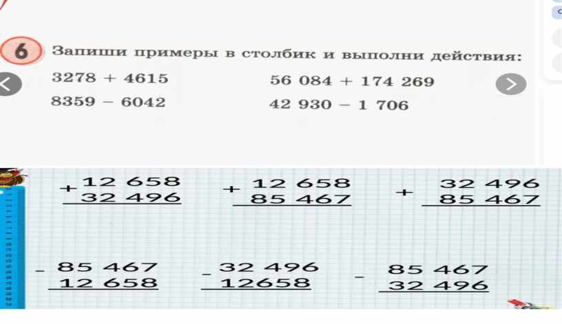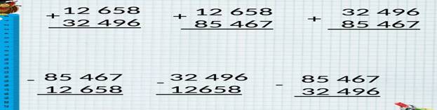 Эта часть работы направлена на повторение сложения и вычитания натуральных чисел. Вспомнить и немного размяться помогут данные примеры. Лучше записывать действия в тетради. Напомните учащимся, что при сложении и вычитании важно записать числа друг под другом, разряд под разрядом.