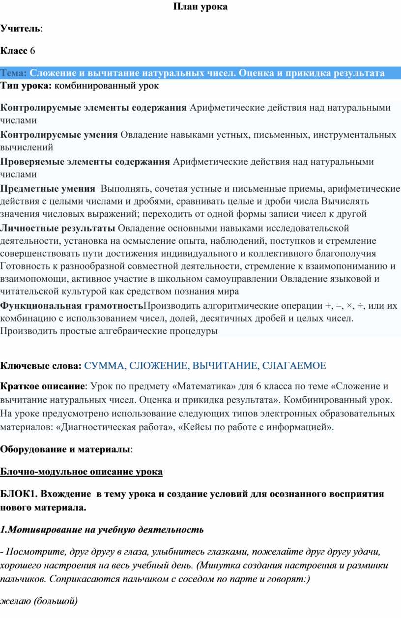 Краткое описание: Урок по предмету «Математика» для 6 класса по теме «Сложение и вычитание натуральных чисел. Оценка и прикидка результата». Комбинированный урок. На уроке предусмотрено использование следующих типов электронных образовательных материалов: «Диагностическая работа», «Кейсы по работе с информацией».