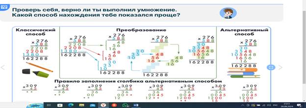 Обратите внимание обучающихся на удобство применения альтернативного способа умножения натуральных многозначных чисел.