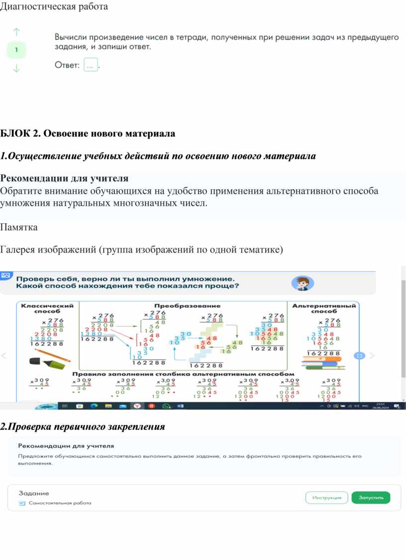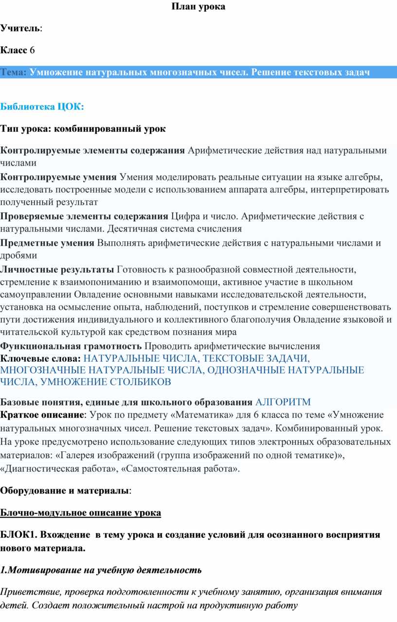 Краткое описание: Урок по предмету «Математика» для 6 класса по теме «Умножение натуральных многозначных чисел. Решение текстовых задач». Комбинированный урок. На уроке предусмотрено использование следующих типов электронных образовательных материалов: «Галерея изображений (группа изображений по одной тематике)», «Диагностическая работа», «Самостоятельная работа».