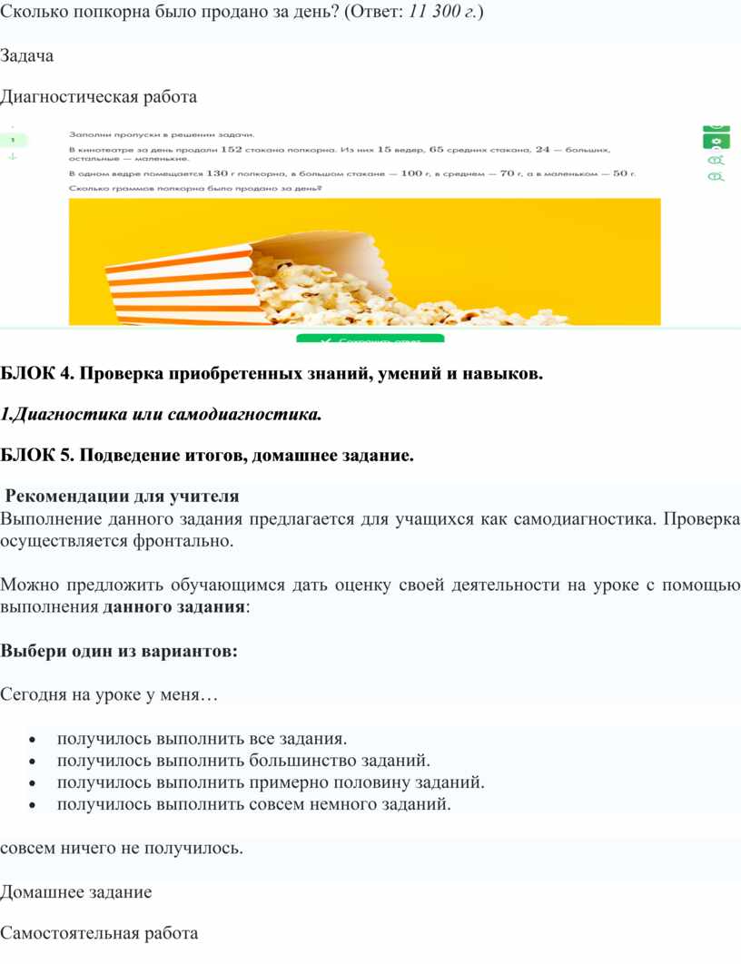 Сколько попкорна было продано за день? (Ответ: 11 300 г.)