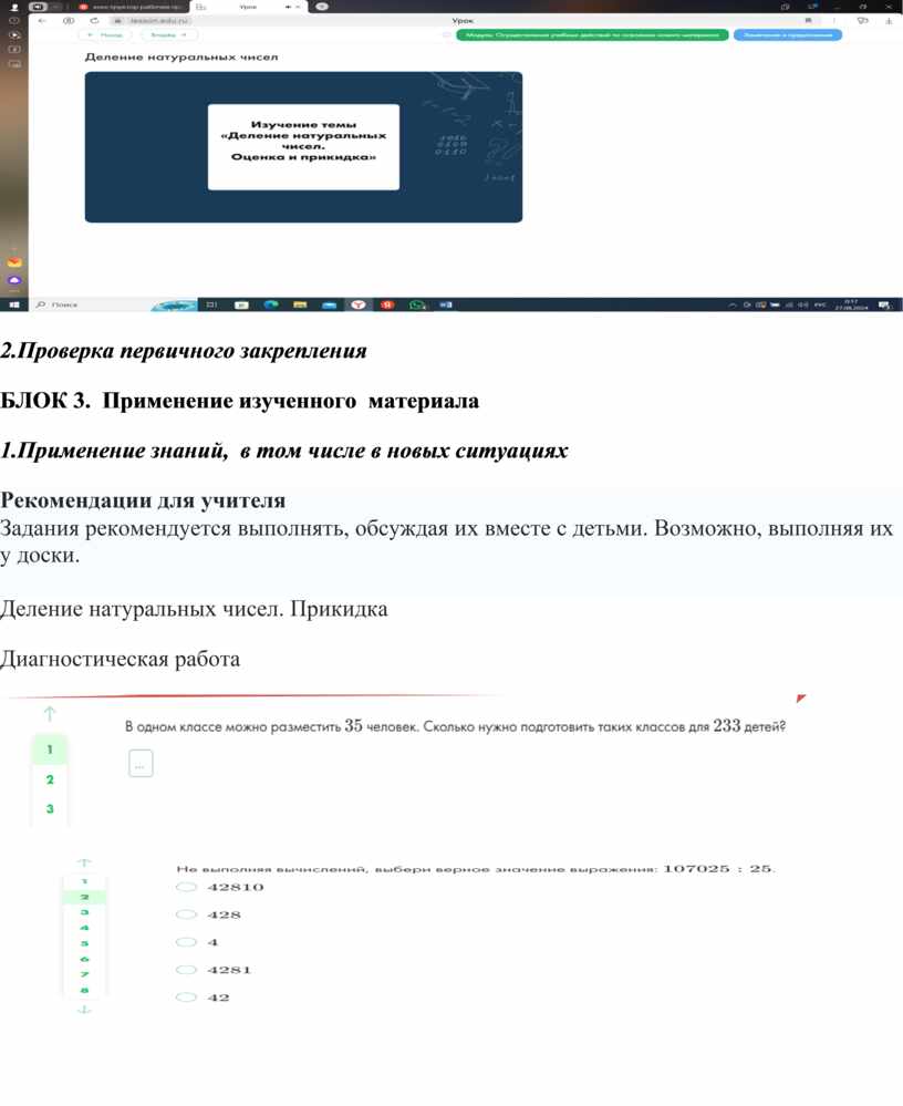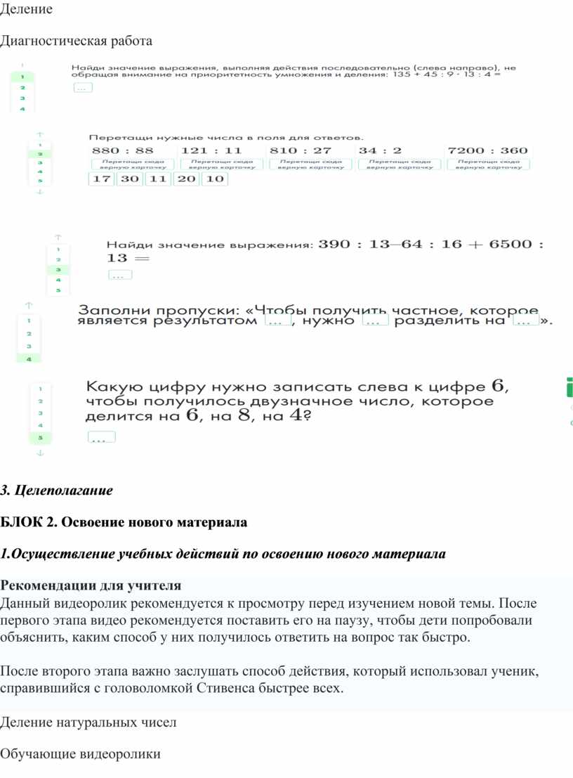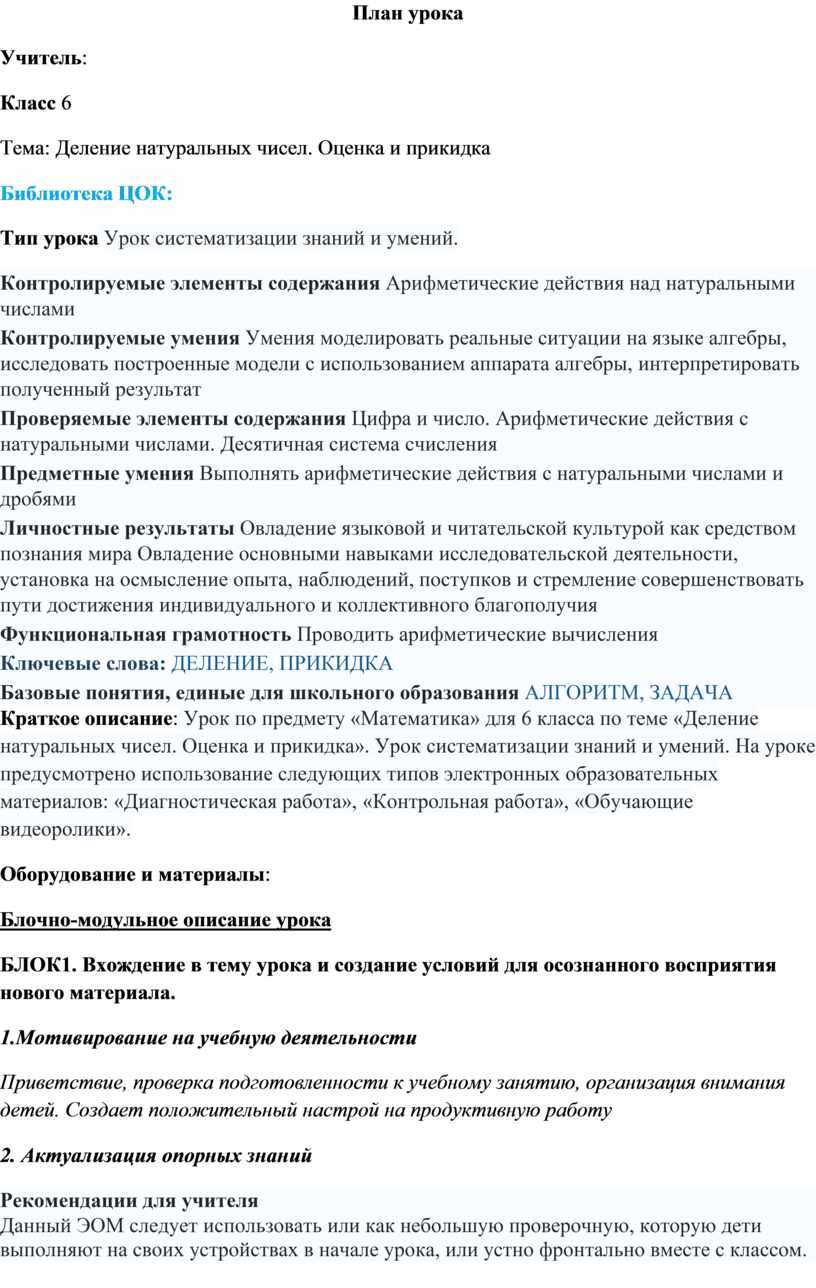Краткое описание: Урок по предмету «Математика» для 6 класса по теме «Деление натуральных чисел. Оценка и прикидка». Урок систематизации знаний и умений. На уроке предусмотрено использование следующих типов электронных образовательных материалов: «Диагностическая работа», «Контрольная работа», «Обучающие видеоролики».