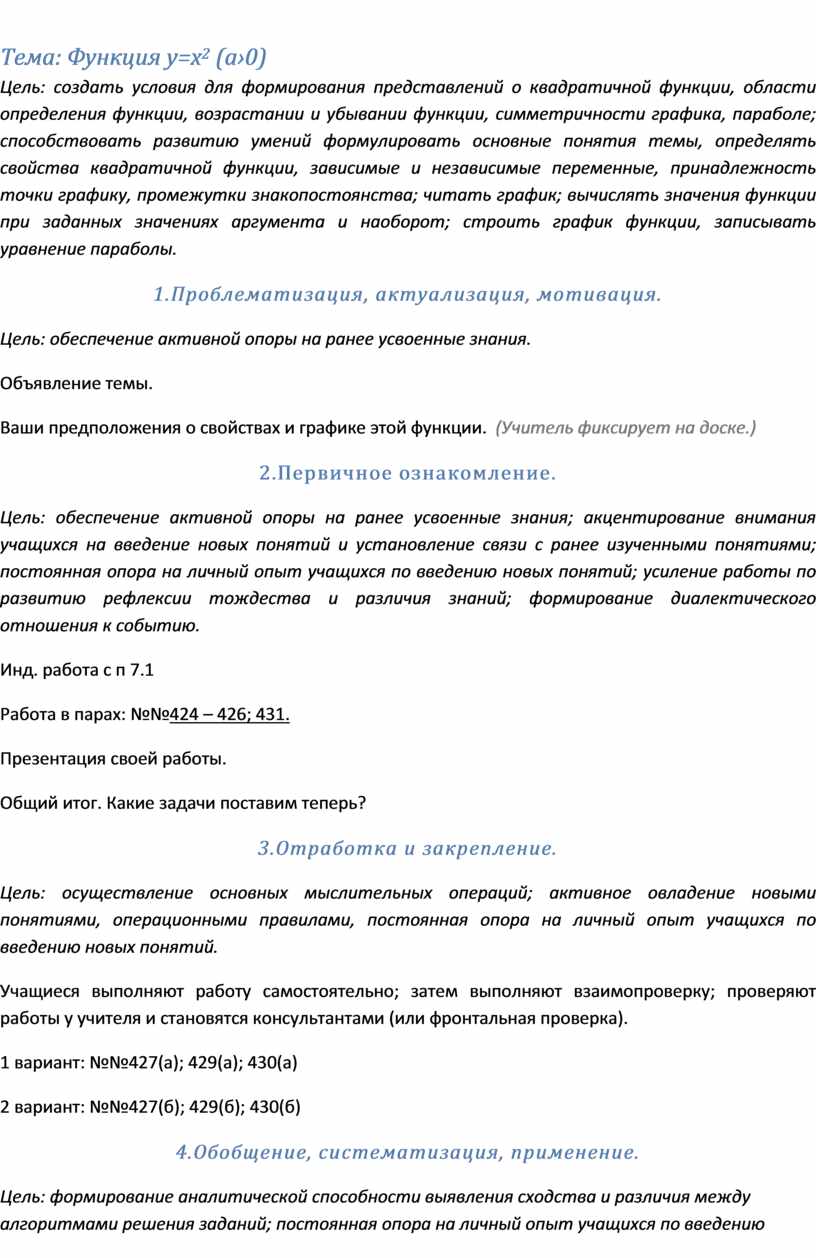 Цель: создать условия для формирования представлений о квадратичной функции, области определения функции, возрастании и убывании функции, симметричности графика, параболе; способствовать развитию умений формулировать основные понятия темы, определять свойства квадратичной функции, зависимые и независимые переменные, принадлежность точки графику, промежутки знакопостоянства; читать график; вычислять значения функции при заданных значениях аргумента и наоборот; строить график функции, записывать уравнение параболы.