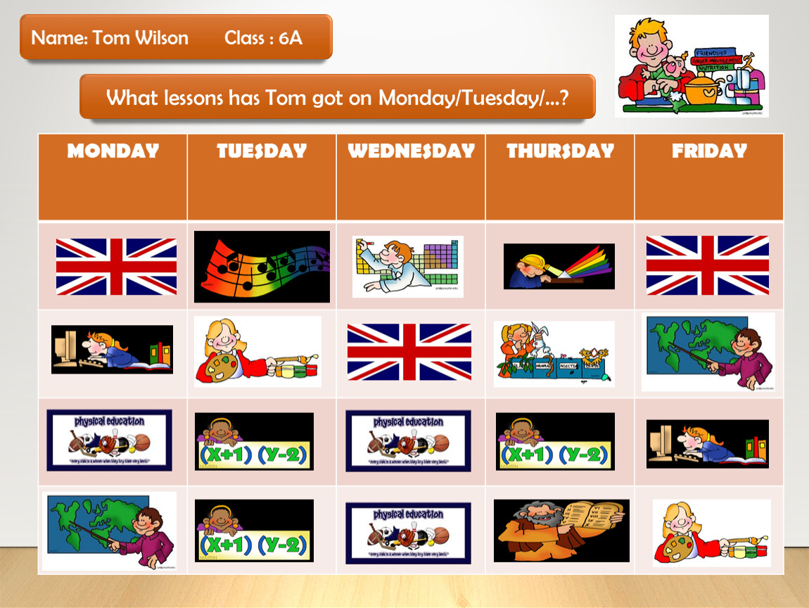 What lessons has Tom got on Monday/Tuesday/…?