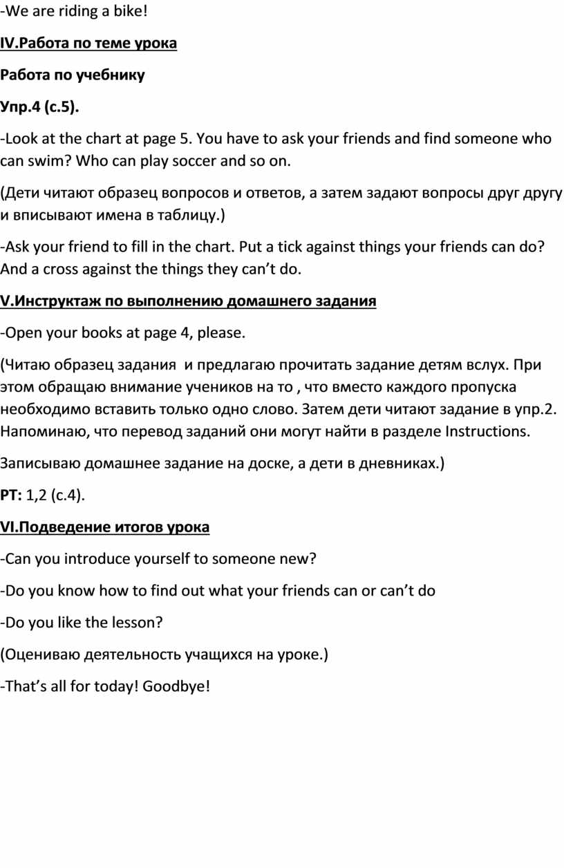 -Look at the chart at page 5. You have to ask your friends and find someone who can swim? Who can play soccer and so on.