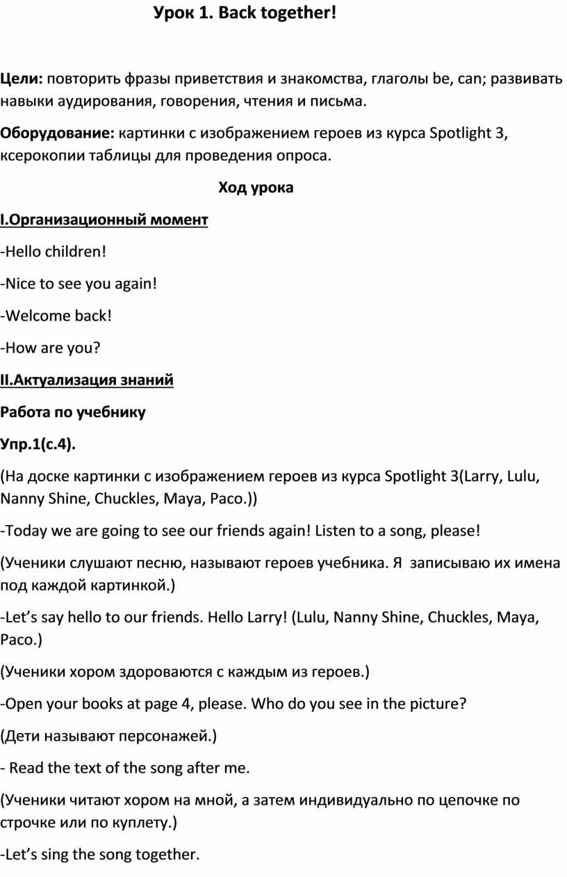 Цели: повторить фразы приветствия и знакомства, глаголы be, can; развивать навыки аудирования, говорения, чтения и письма.