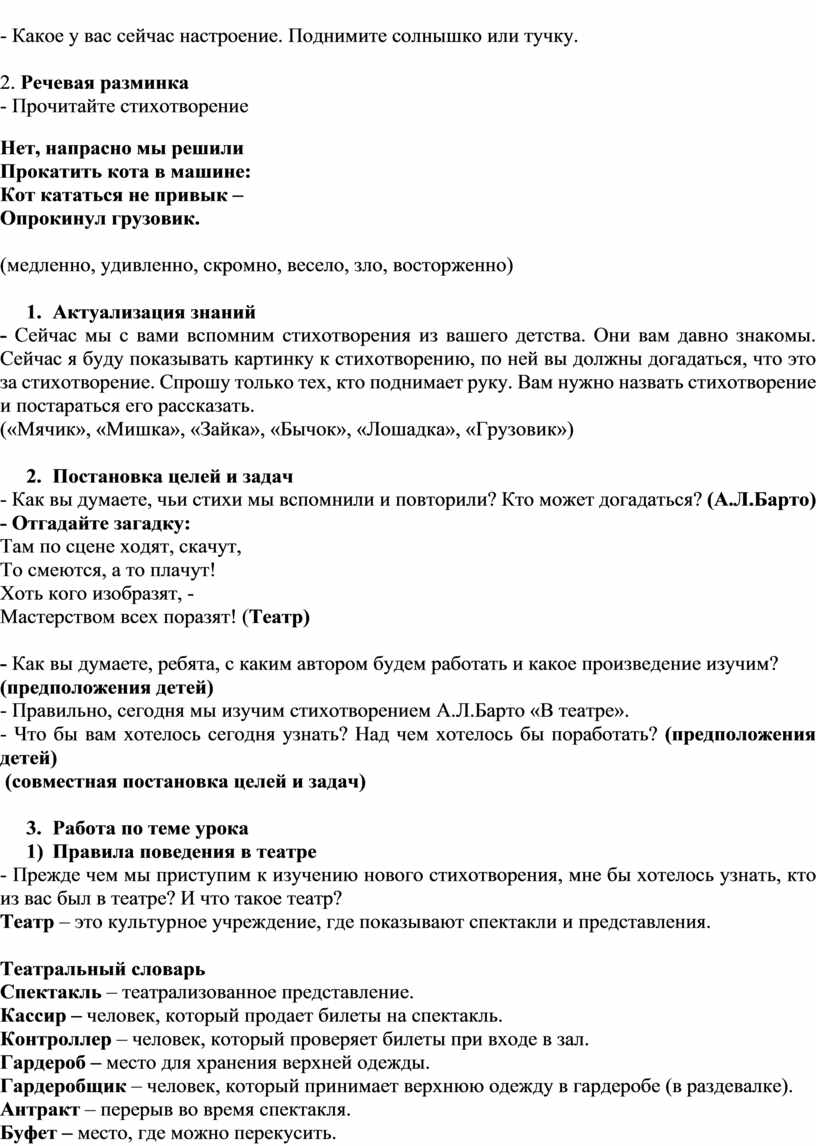 Предметные: познакомить с произведением А. Л. Барто «В театре».