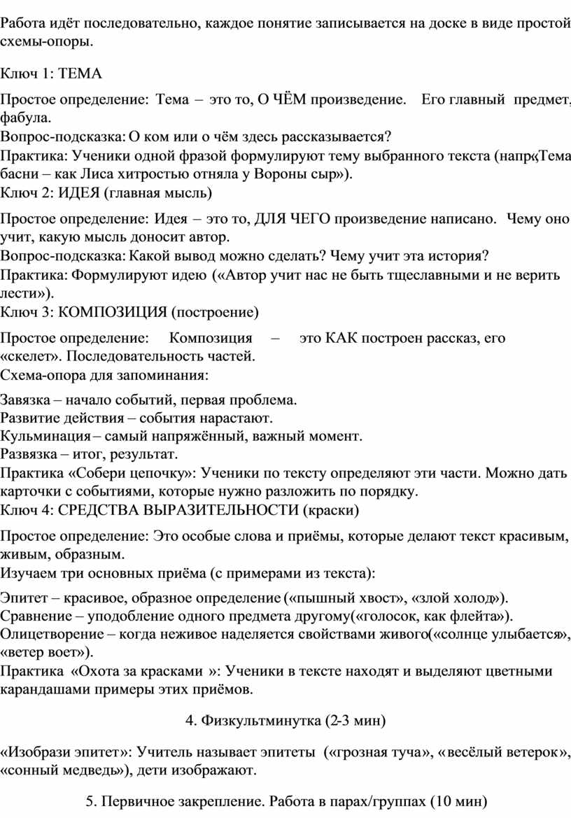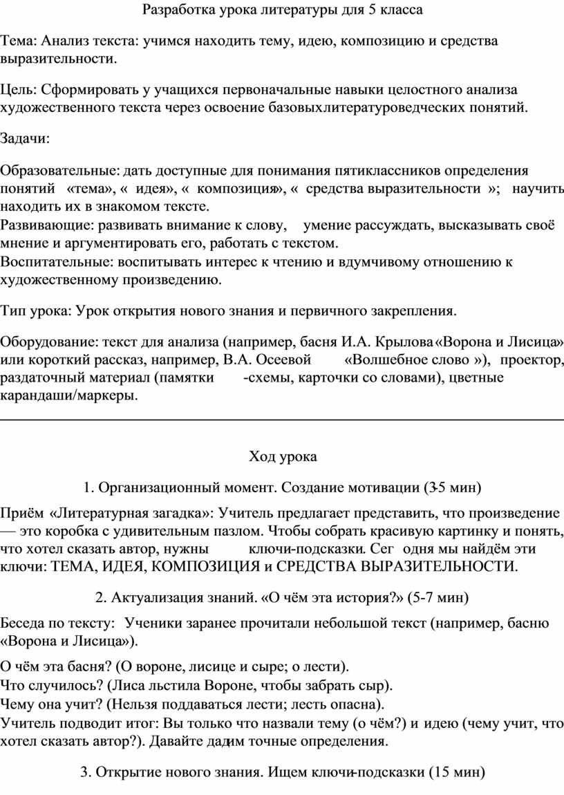 Оборудование: текст для анализа (например, басня И.А. Крылова «Ворона и Лисица» или короткий рассказ, например, В.А. Осеевой «Волшебное слово»), проектор, раздаточный материал (памятки-схемы, карточки со словами), цветные карандаши/маркеры.