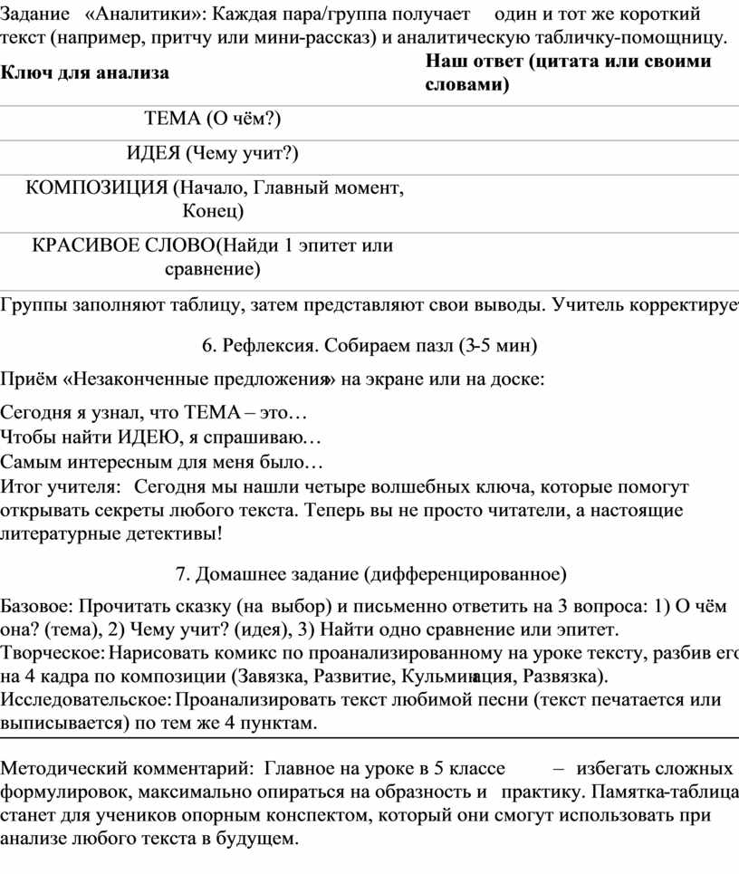 · Задание «Аналитики»: Каждая пара/группа получает один и тот же короткий текст (например, притчу или мини-рассказ) и аналитическую табличку-помощницу.
