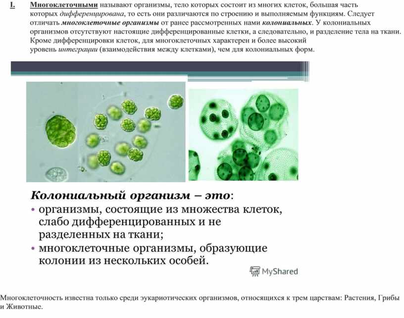 I. Многоклеточными называют организмы, тело которых состоит из многих клеток, большая часть которых дифференцирована, то есть они различаются по строению и выполняемым функциям. Следует отличать многоклеточные организмы от ранее рассмотренных нами колониальных. У колониальных организмов отсутствуют настоящие дифференцированные клетки, а следовательно, и разделение тела на ткани. Кроме дифференцировки клеток, для многоклеточных характерен и более высокий уровень интеграции (взаимодействия между клетками), чем для колониальных форм.