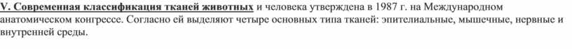 V. Современная классификация тканей животных и человека утверждена в 1987 г. на Международном анатомическом конгрессе. Согласно ей выделяют четыре основных типа тканей: эпителиальные, мышечные, нервные и внутренней среды.