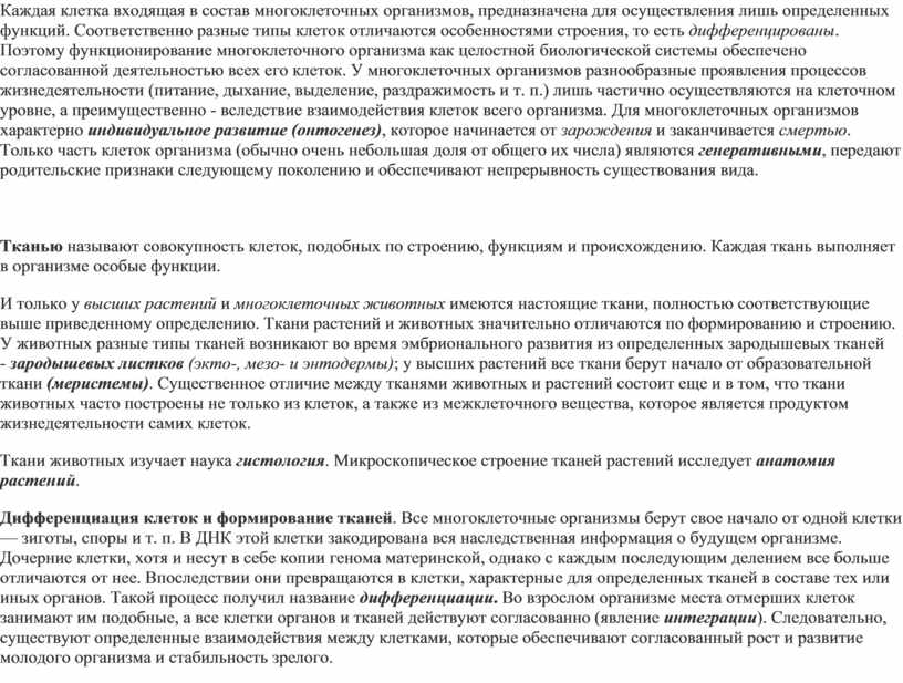 Каждая клетка входящая в состав многоклеточных организмов, предназначена для осуществления лишь определенных функций. Соответственно разные типы клеток отличаются особенностями строения, то есть дифференцированы. Поэтому функционирование многоклеточного организма как целостной биологической системы обеспечено согласованной деятельностью всех его клеток. У многоклеточных организмов разнообразные проявления процессов жизнедеятельности (питание, дыхание, выделение, раздражимость и т. п.) лишь частично осуществляются на клеточном уровне, а преимущественно - вследствие взаимодействия клеток всего организма. Для многоклеточных организмов характерно индивидуальное развитие (онтогенез), которое начинается от зарождения и заканчивается смертью. Только часть клеток организма (обычно очень небольшая доля от общего их числа) являются генеративными, передают родительские признаки следующему поколению и обеспечивают непрерывность существования вида.
