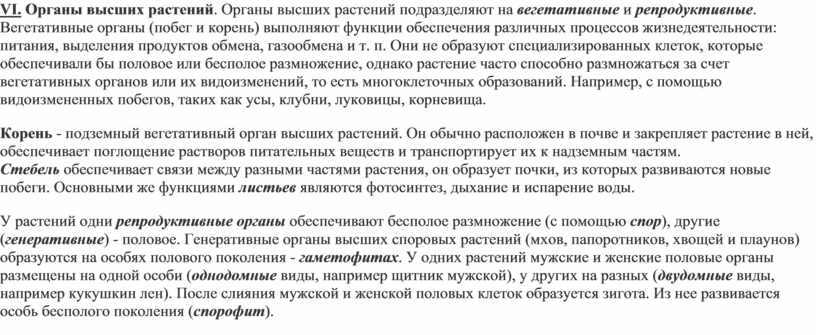 VI. Органы высших растений. Органы высших растений подразделяют на вегетативные и репродуктивные. Вегетативные органы (побег и корень) выполняют функции обеспечения различных процессов жизнедеятельности: питания, выделения продуктов обмена, газообмена и т. п. Они не образуют специализированных клеток, которые обеспечивали бы половое или бесполое размножение, однако растение часто способно размножаться за счет вегетативных органов или их видоизменений, то есть многоклеточных образований. Например, с помощью видоизмененных побегов, таких как усы, клубни, луковицы, корневища.