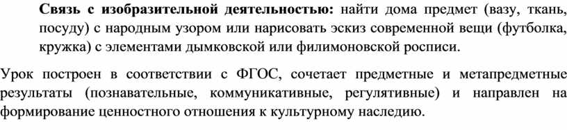 Связь с изобразительной деятельностью: найти дома предмет (вазу, ткань, посуду) с народным узором или нарисовать эскиз современной вещи (футболка, кружка) с элементами дымковской или филимоновской росписи.