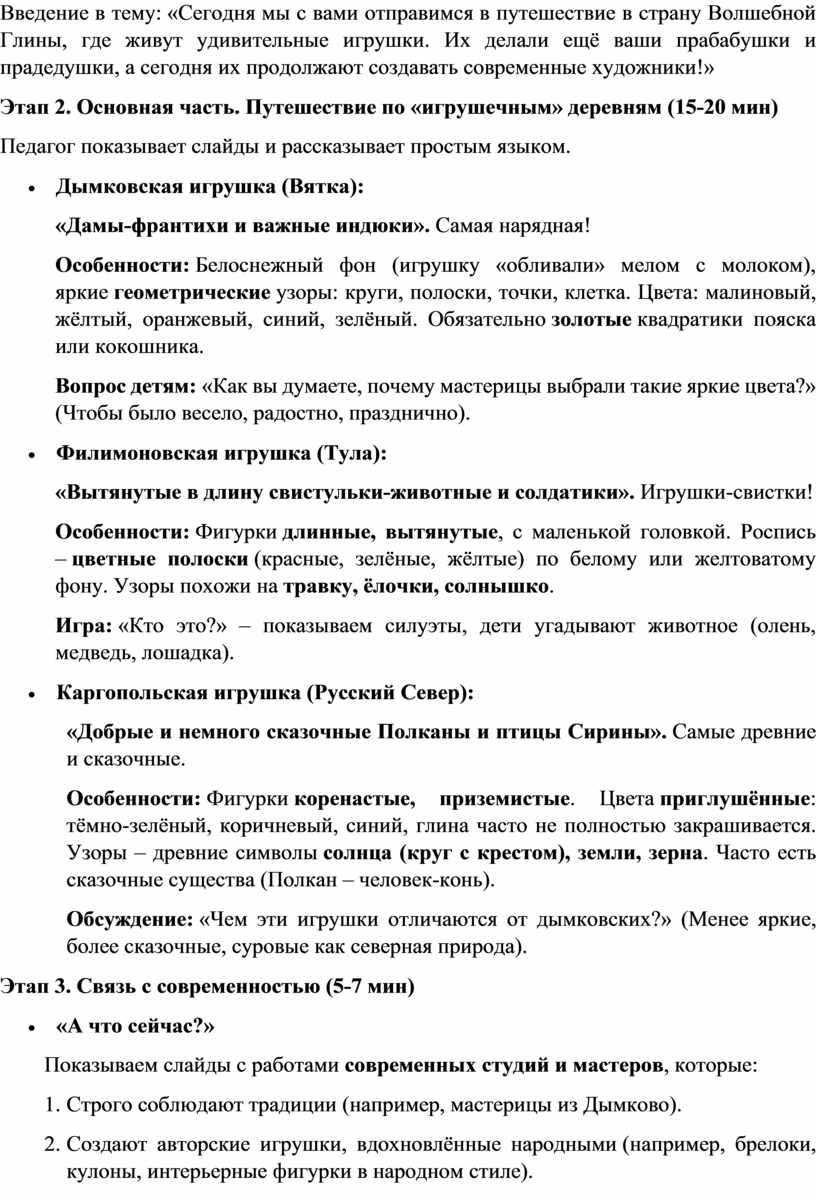 Введение в тему: «Сегодня мы с вами отправимся в путешествие в страну Волшебной Глины, где живут удивительные игрушки. Их делали ещё ваши прабабушки и прадедушки, а сегодня их продолжают создавать современные художники!»