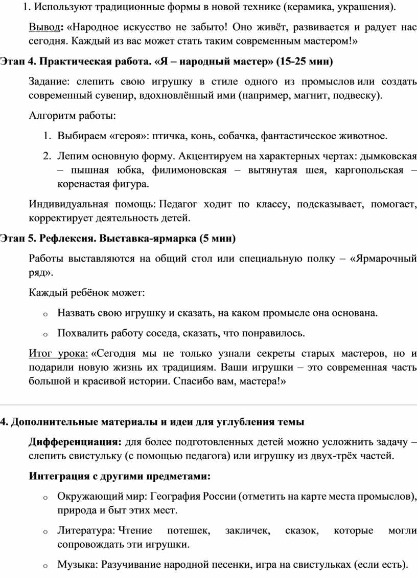 Вывод: «Народное искусство не забыто! Оно живёт, развивается и радует нас сегодня. Каждый из вас может стать таким современным мастером!»