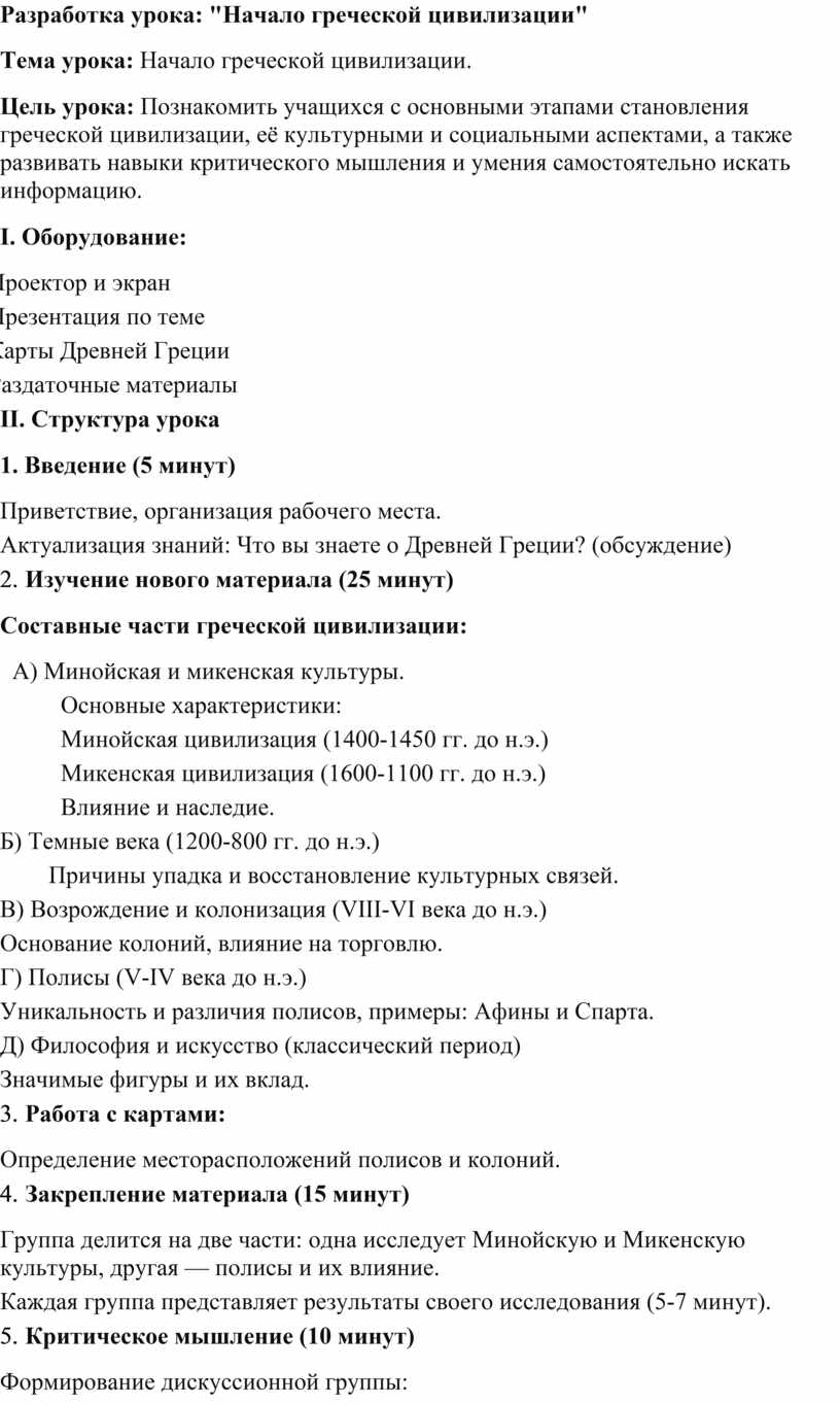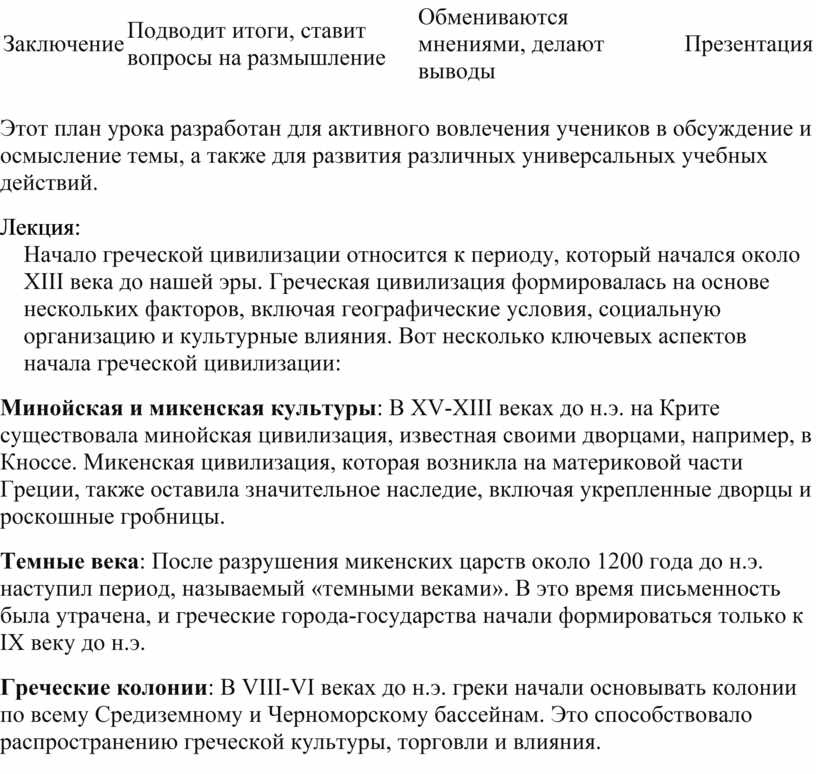 Цель урока: Познакомить учащихся с основными этапами становления греческой цивилизации, её культурными и социальными аспектами, а также развивать навыки критического мышления и умения самостоятельно искать информацию.