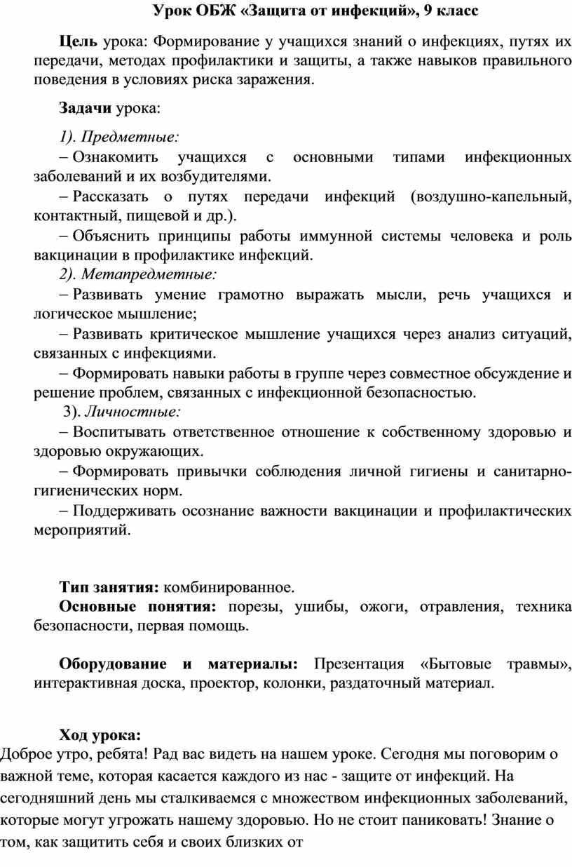 Урок ОБЖ «Защита от инфекций», 9 класс
