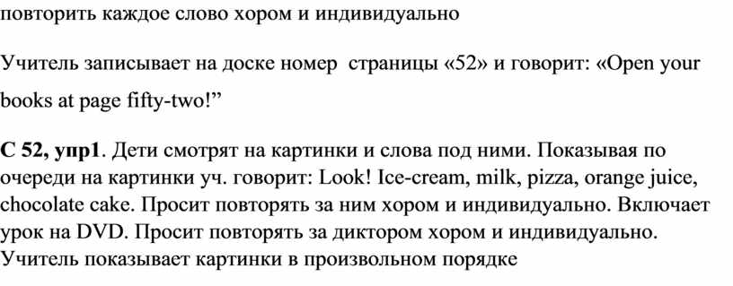 Now, please, listen to me. What is my favourite food? Вы поняли вопрос? Пожалуйста, переведите. Какая моя любимая еда? Чтобы ответить на этот вопрос нужно сказатьYour favourite food is bananas. А сейчас послушайте загадки и вы узнаете ответ на этот вопрос. Знают дети, обезьяна любит фрукт, что звать…(banana) Запах чудесный, нельзя ошибиться, это ж друзья, итальянская ….(pizza) От жары сейчас сгорим, ох, подайте нам…(ice-cream) Ростом я своим горжусь, с детства пью я …(orange juice). Now, look at the blackboard. Show me, what I like. What is my favourite food? (вызывает детей к доске по одному (4 человека), они на доске передвигают продукты в сторону корзины и говорятYour favourite food is….. Учитель показывает картинки с изображением еды, называет и просит повторить каждое слово хором и индивидуально Учитель записывает на доске номер страницы «52» и говорит: «Open your books at page fifty-two!” C 52, упр1. Дети смотрят на картинки и слова под ними. Показывая по очереди на картинки уч. говорит: Look! Ice-cream, milk, pizza, orange juice, chocolate cake. Просит повторять за ним хором и индивидуально. Включает урок на DVD. Просит повторять за диктором хором и индивидуально. Учитель показывает картинки в произвольном порядке и просит назвать продукты, изображённые на картинках. Учитель предлагает выполнить упр 2 Look at the picture! It is a birthday party. Lulu is five today. What’s on the table? (chocolate cake). Предлагает послушать и спеть песню, встав в круг