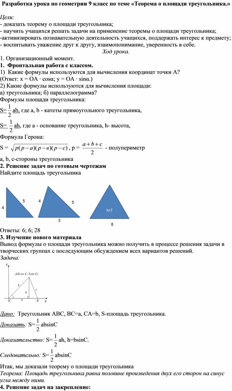 Разработка урока по геометрии 9 класс по теме «Теорема о площади треугольника.»