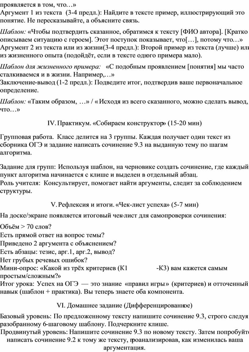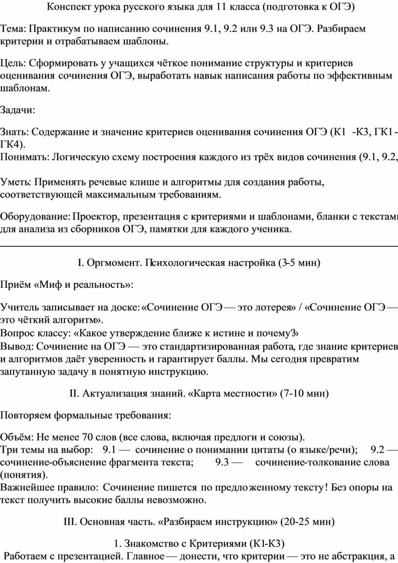 Цель: Сформировать у учащихся чёткое понимание структуры и критериев оценивания сочинения ОГЭ, выработать навык написания работы по эффективным шаблонам.