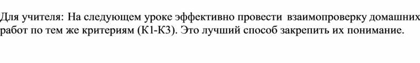 Для учителя: На следующем уроке эффективно провести взаимопроверку домашних работ по тем же критериям (К1-К3). Это лучший способ закрепить их понимание.