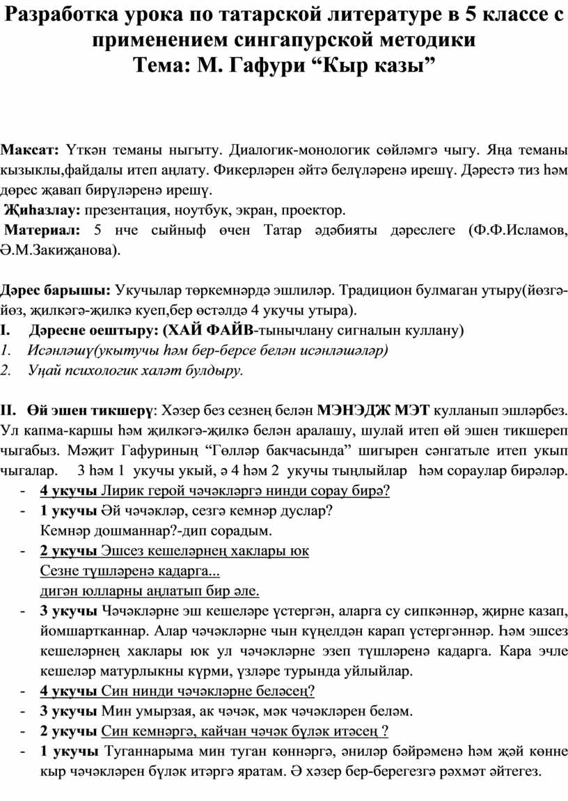 Разработка урока по татарской литературе в 5 классе с применением сингапурской методики