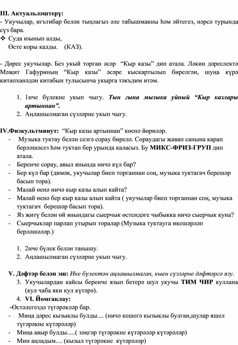 1. 1нче бүлекне укып чыгу. Тын гына мызыка уйный “Кыр казлары артыннан”.