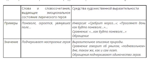 автор прибегает к инверсии, делая акценты на глаголах, передающих активную жизнь природы: «сребрит мороз», « проглянет день», «роняет лес», образ природы красочный, живой, пейзажная картина наполнена цветом, багряным, серебряным.