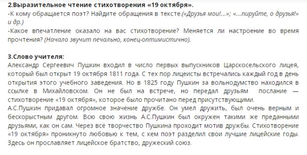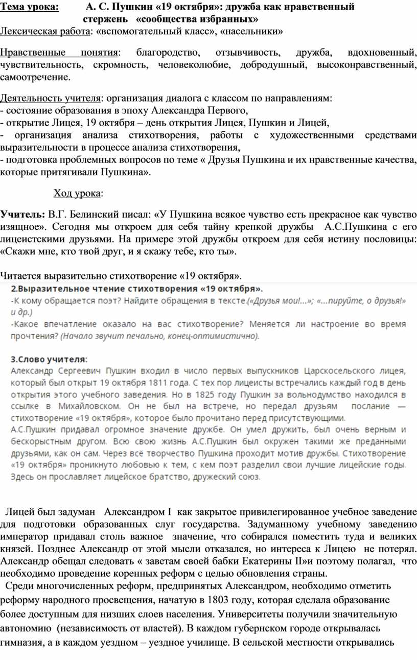 Тема урока: А. С. Пушкин «19 октября»: дружба как нравственный