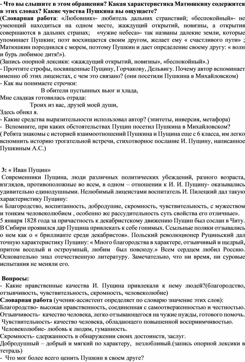 (Словарная работа: «Любовник»- любитель дальних странствий; «беспокойный»- не умеющий находиться на одном месте, жаждущий открытий, новизны, а открытия совершаются в дальних странах; «чужие небеса»- так названы далекие земли, которые упоминает Пушкин; поэт восхищается своим другом, желает ему « счастливого пути» ; Матюшкин породнился с морем, поэтому Пушкин и дает определение своему другу: « волн и бурь любимое дитя!»).