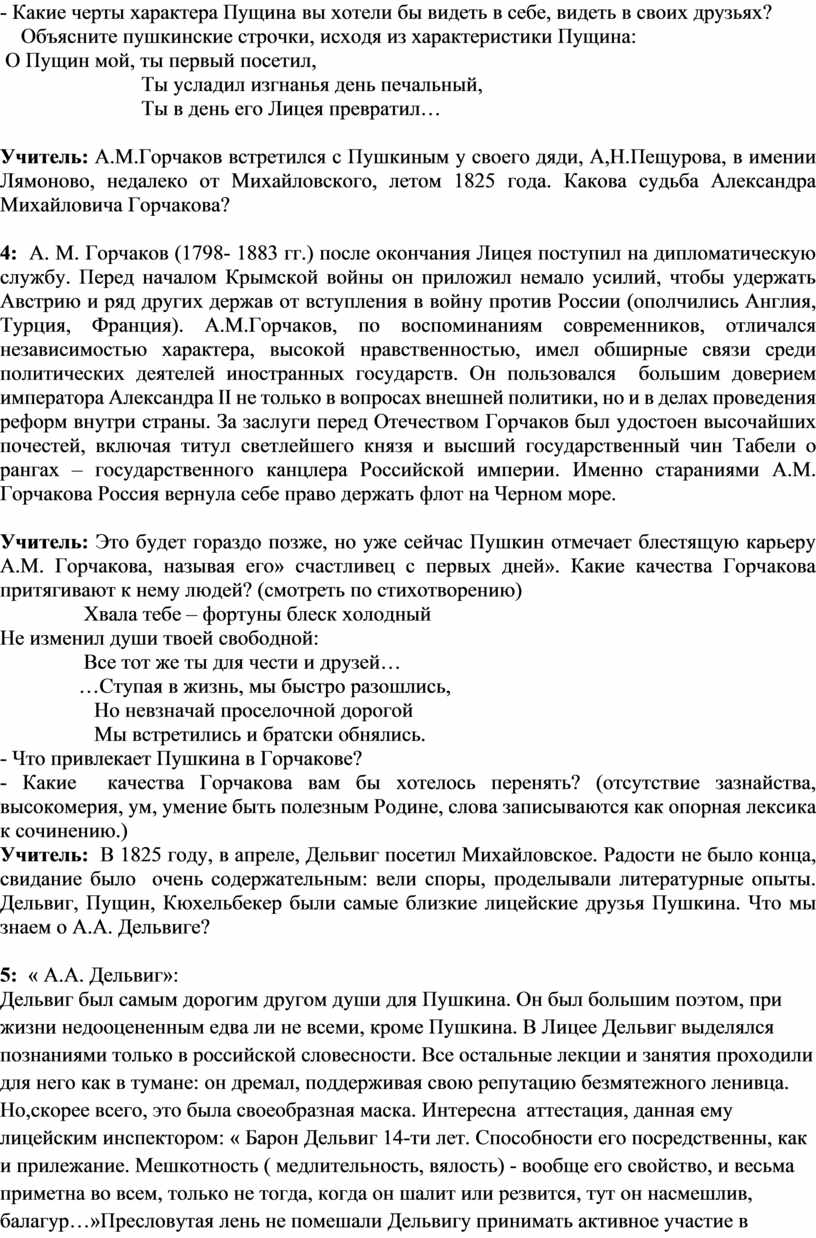 Учитель: Это будет гораздо позже, но уже сейчас Пушкин отмечает блестящую карьеру А.М. Горчакова, называя его» счастливец с первых дней». Какие качества Горчакова притягивают к нему людей? (смотреть по стихотворению)