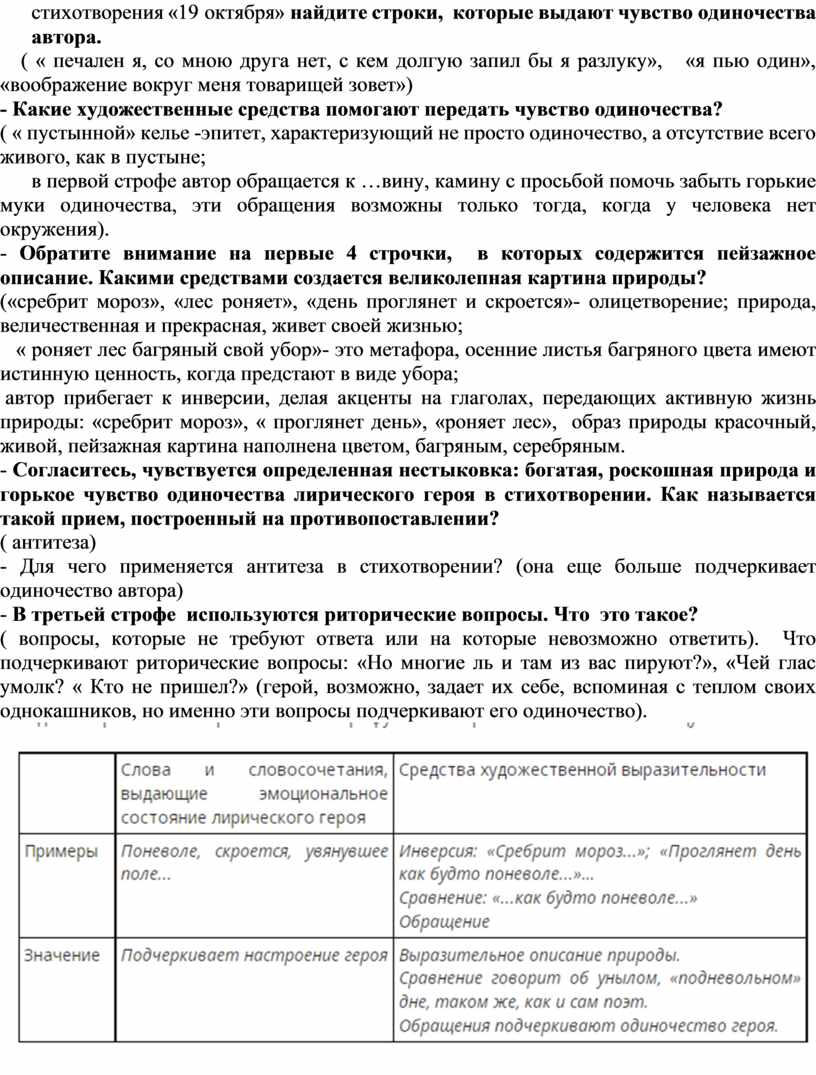 ( вопросы, которые не требуют ответа или на которые невозможно ответить). Что подчеркивают риторические вопросы: «Но многие ль и там из вас пируют?», «Чей глас умолк? « Кто не пришел?» (герой, возможно, задает их себе, вспоминая с теплом своих однокашников, но именно эти вопросы подчеркивают его одиночество).