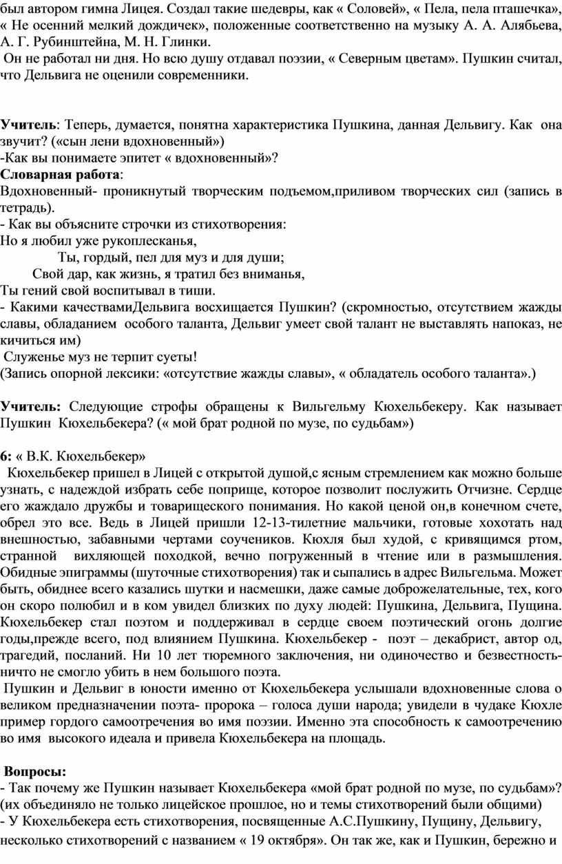 Учитель: Следующие строфы обращены к Вильгельму Кюхельбекеру. Как называет Пушкин Кюхельбекера? (« мой брат родной по музе, по судьбам»)