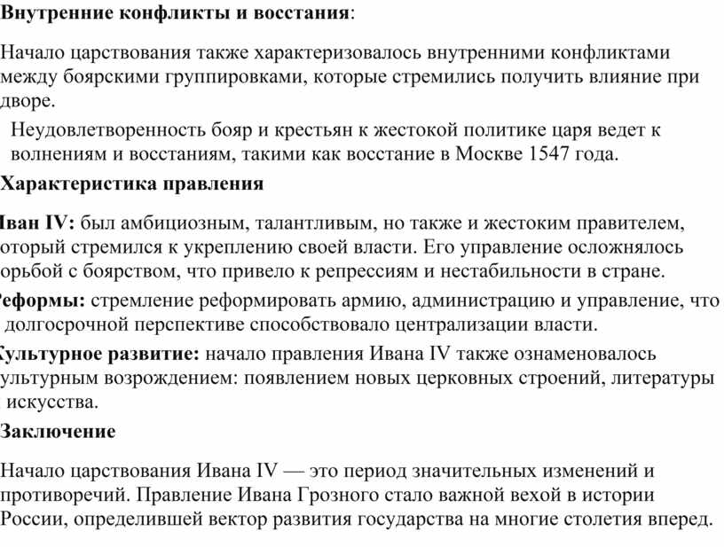 Начало царствования Ивана IV — это период значительных изменений и противоречий. Правление Ивана Грозного стало важной вехой в истории России, определившей вектор развития государства на многие столетия вперед.