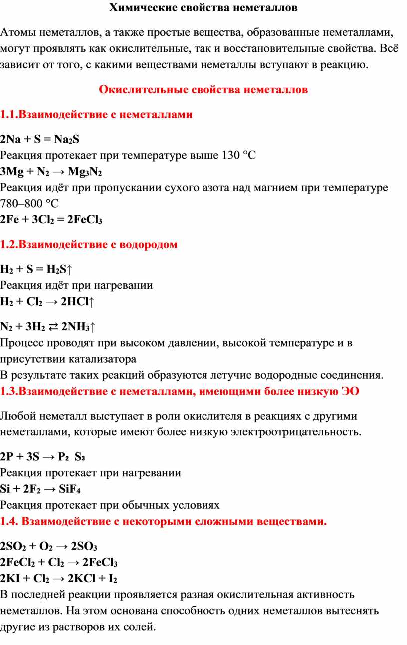 Атомы неметаллов, а также простые вещества, образованные неметаллами, могут проявлять как окислительные, так и восстановительные свойства. Всё зависит от того, с какими веществами неметаллы вступают в реакцию.
