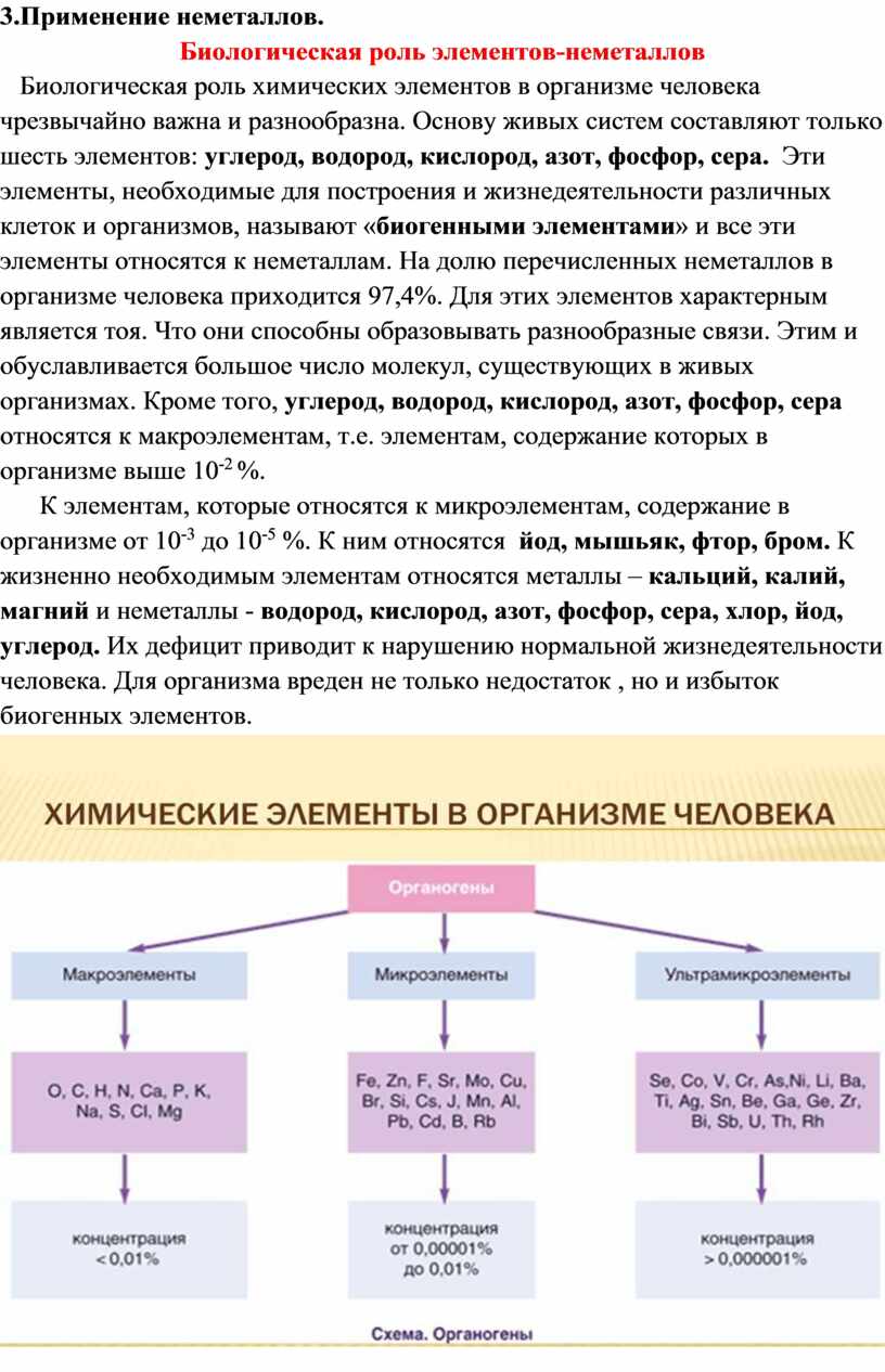 К элементам, которые относятся к микроэлементам, содержание в организме от 10-3 до 10-5 %. К ним относятся йод, мышьяк, фтор, бром. К жизненно необходимым элементам относятся металлы – кальций, калий, магний и неметаллы - водород, кислород, азот, фосфор, сера, хлор, йод, углерод. Их дефицит приводит к нарушению нормальной жизнедеятельности человека. Для организма вреден не только недостаток , но и избыток биогенных элементов.