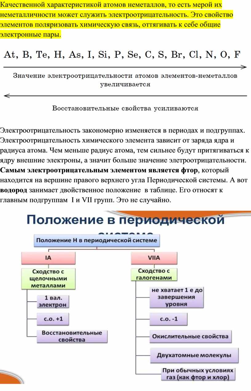 Качественной характеристикой атомов неметаллов, то есть мерой их неметалличности может служить электроотрицательность. Это свойство элементов поляризовать химическую связь, оттягивать к себе общие электронные пары.