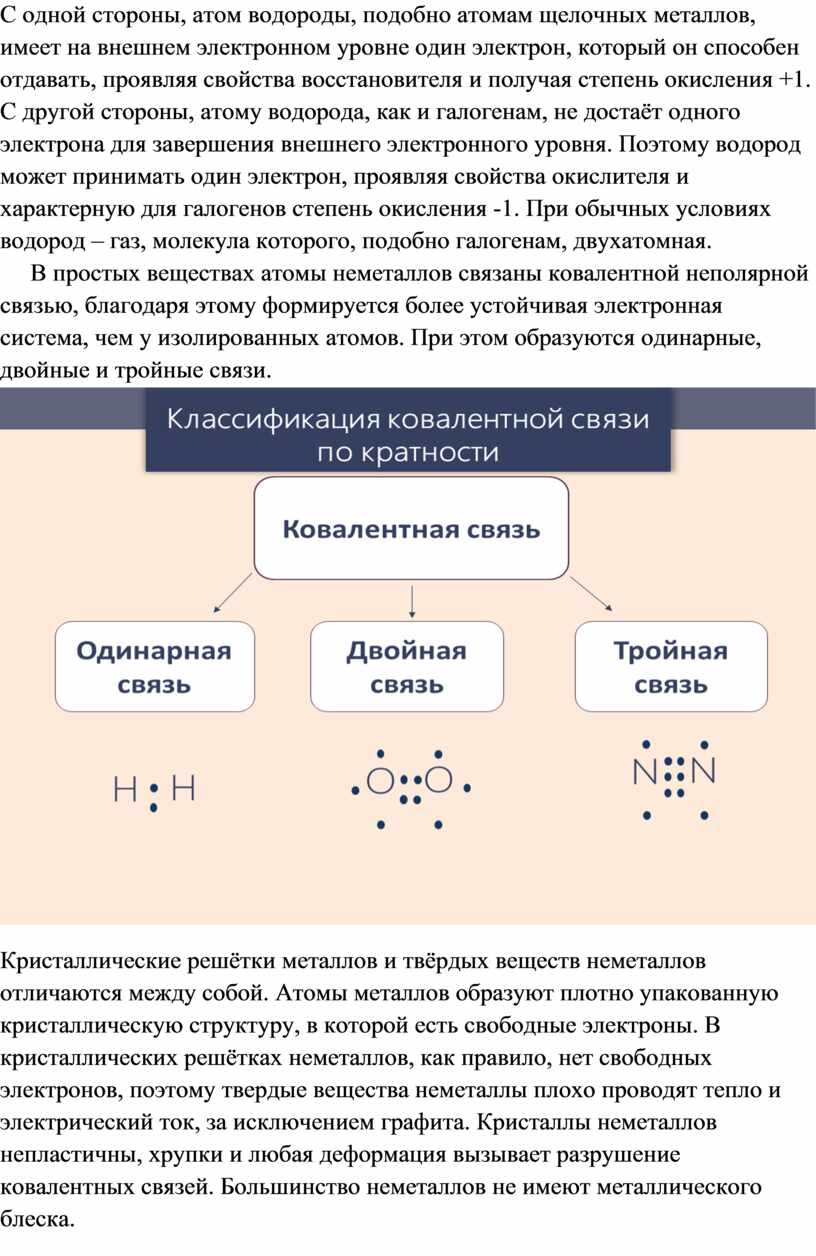 В простых веществах атомы неметаллов связаны ковалентной неполярной связью, благодаря этому формируется более устойчивая электронная система, чем у изолированных атомов. При этом образуются одинарные, двойные и тройные связи.