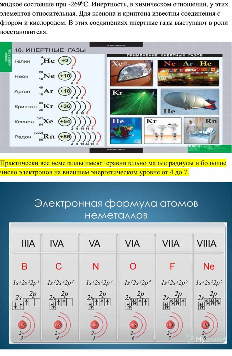 Практически все неметаллы имеют сравнительно малые радиусы и большое число электронов на внешнем энергетическом уровне от 4 до 7.