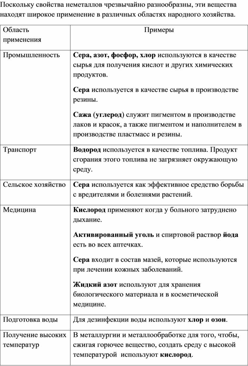 Поскольку свойства неметаллов чрезвычайно разнообразны, эти вещества находят широкое применение в различных областях народного хозяйства.