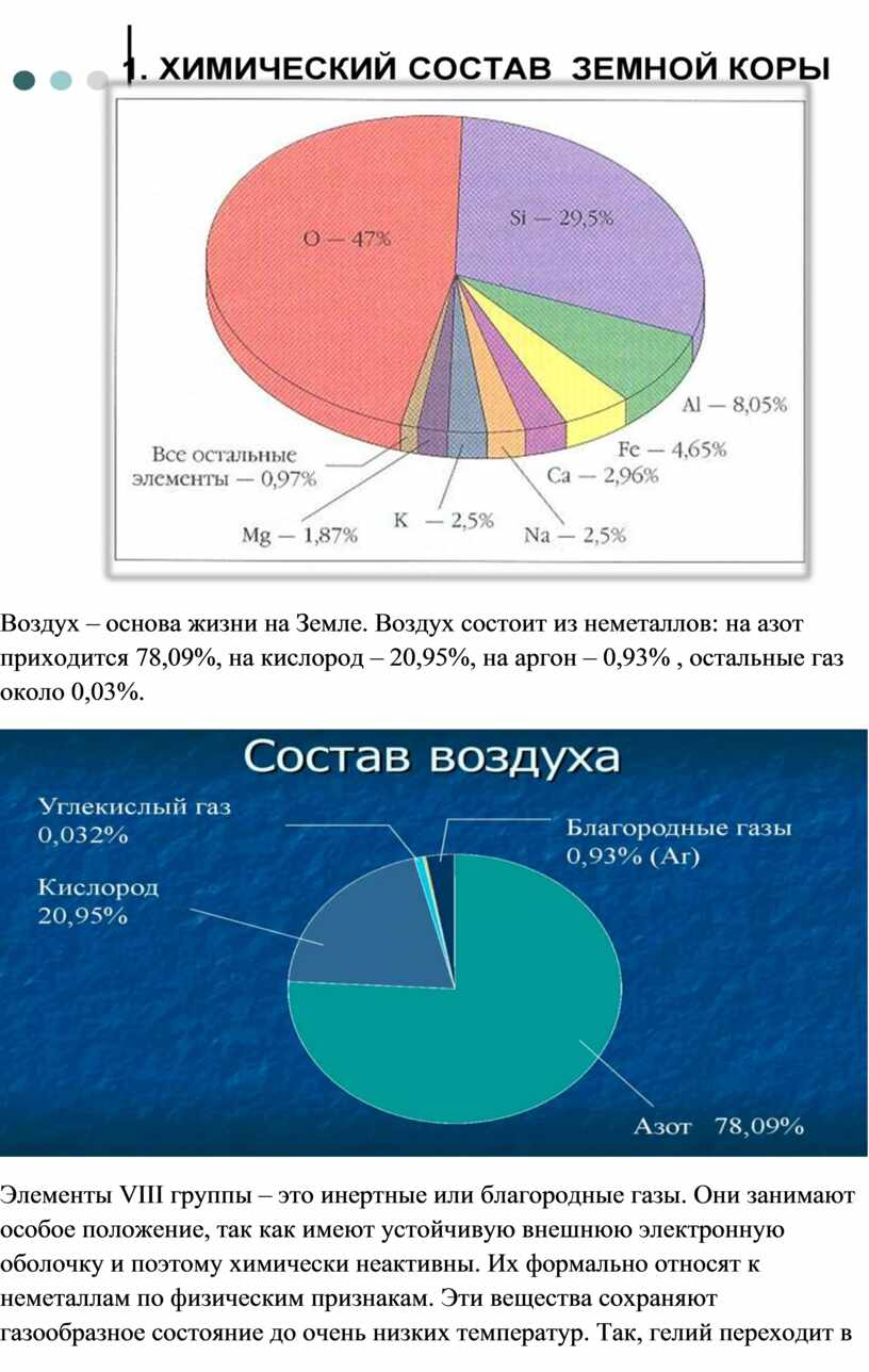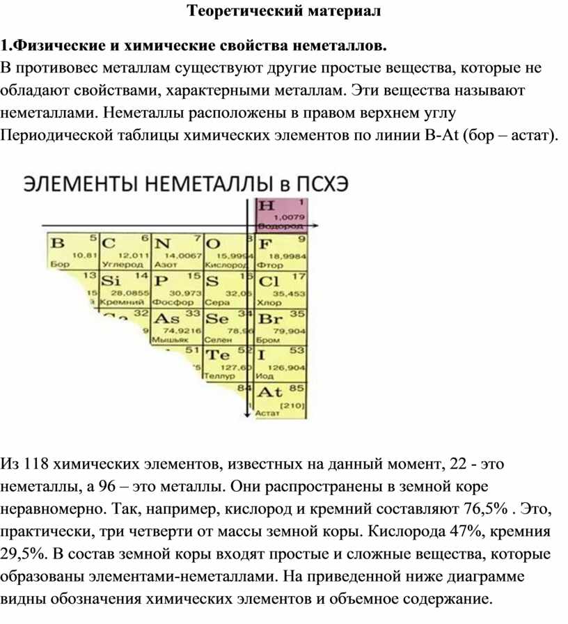 Из 118 химических элементов, известных на данный момент, 22 - это неметаллы, а 96 – это металлы. Они распространены в земной коре неравномерно. Так, например, кислород и кремний составляют 76,5% . Это, практически, три четверти от массы земной коры. Кислорода 47%, кремния 29,5%. В состав земной коры входят простые и сложные вещества, которые образованы элементами-неметаллами. На приведенной ниже диаграмме видны обозначения химических элементов и объемное содержание.
