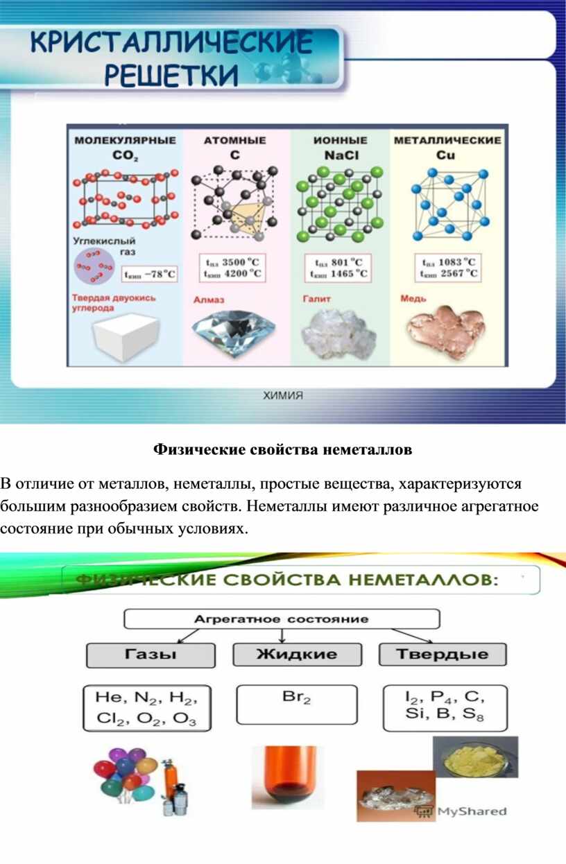 Кристаллические решётки металлов и твёрдых веществ неметаллов отличаются между собой. Атомы металлов образуют плотно упакованную кристаллическую структуру, в которой есть свободные электроны. В кристаллических решётках неметаллов, как правило, нет свободных электронов, поэтому твердые вещества неметаллы плохо проводят тепло и электрический ток, за исключением графита. Кристаллы неметаллов непластичны, хрупки и любая деформация вызывает разрушение ковалентных связей. Большинство неметаллов не имеют металлического блеска.