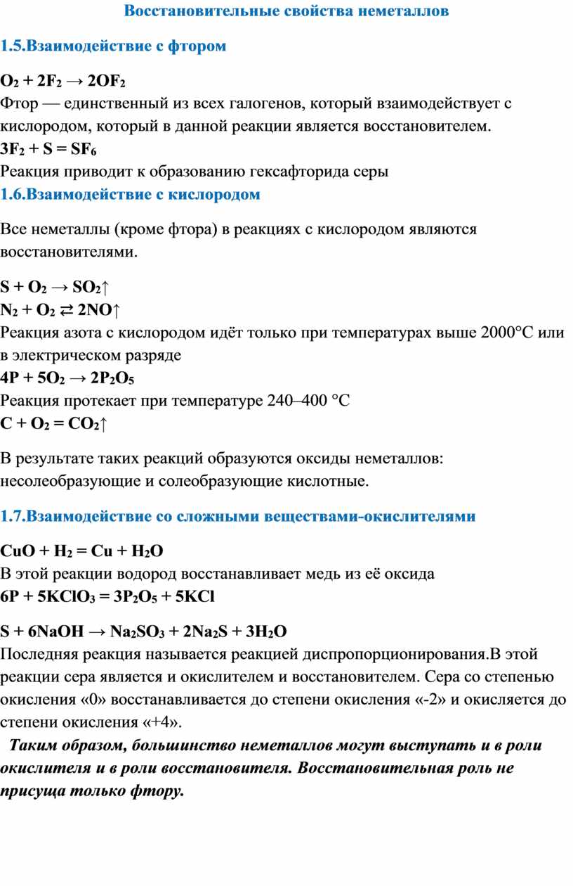 Таким образом, большинство неметаллов могут выступать и в роли окислителя и в роли восстановителя. Восстановительная роль не присуща только фтору.