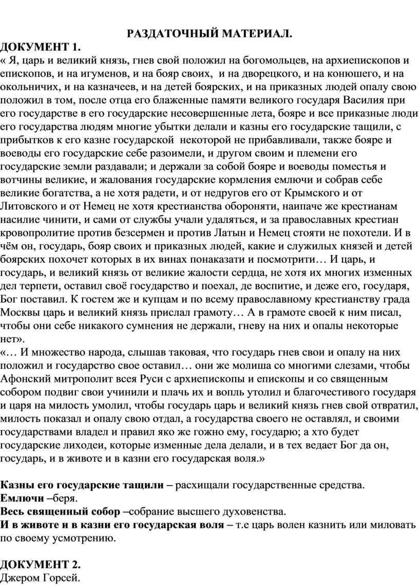 · Раздаточный материал ( проблемные вопросы и источники по теме «Опричнина Ивана Грозного»);
