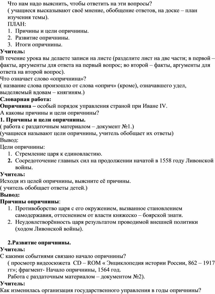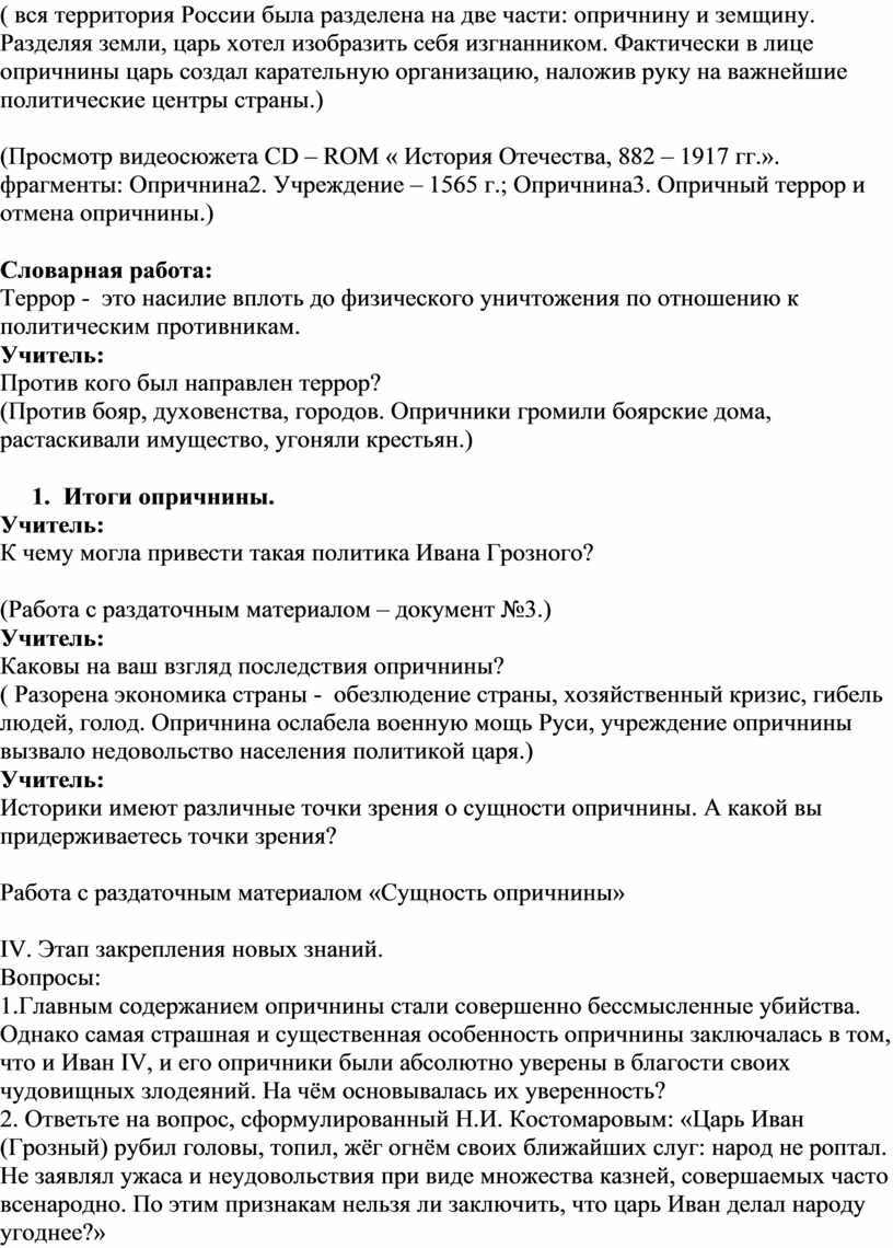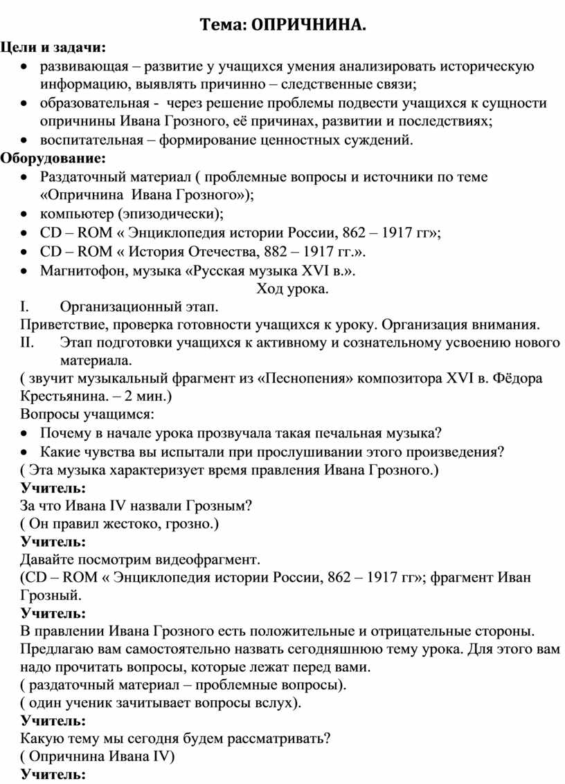 · образовательная - через решение проблемы подвести учащихся к сущности опричнины Ивана Грозного, её причинах, развитии и последствиях;