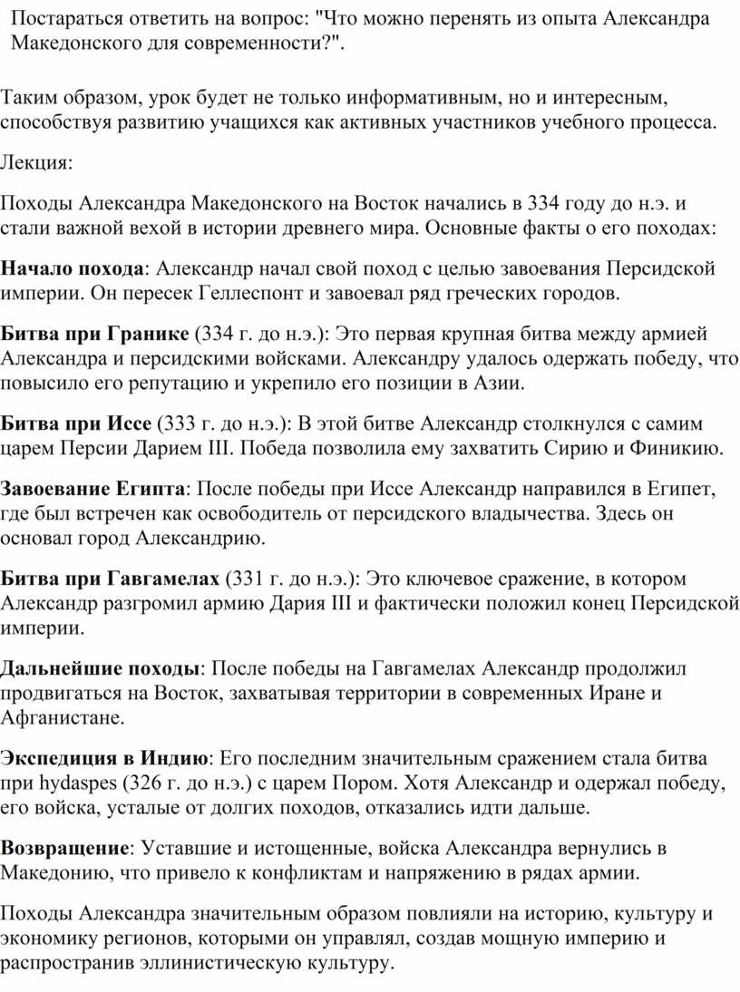 Постараться ответить на вопрос: "Что можно перенять из опыта Александра Македонского для современности?".